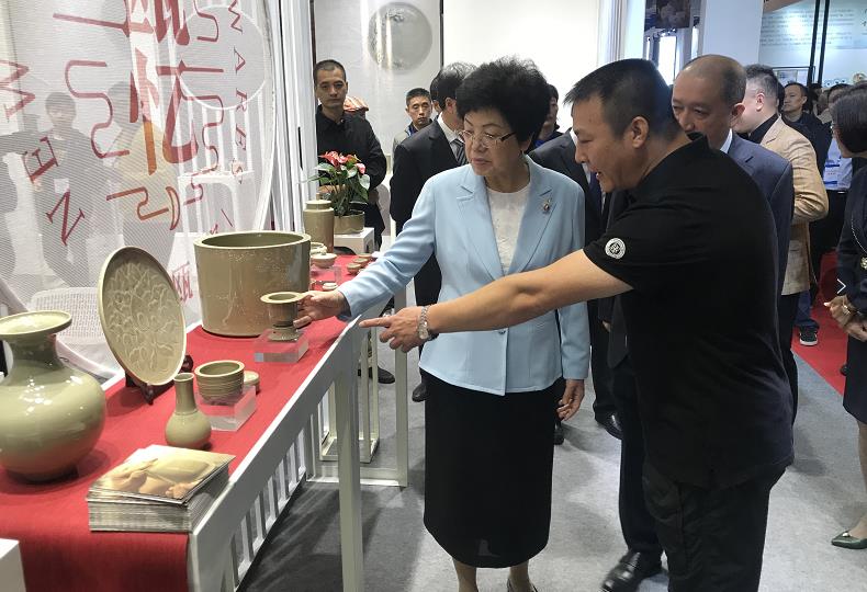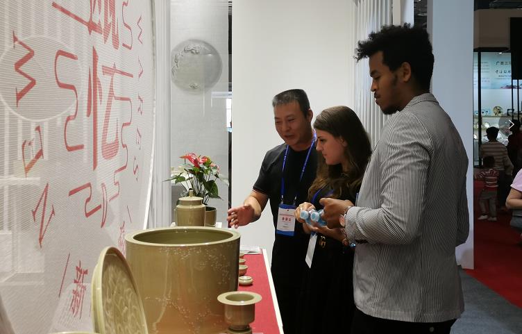 由国家商务部、中国国际贸易促进委员会、中国轻工业联合会和江西省人民政府共同主办的2019第届中国景德镇国际陶瓷博览会10月18日在景德镇国际会展中心开幕。此次展会吸引了全球各地的上千家陶瓷展商参会。来自浙江温州的青瓷瓯窑缥瓷,在开幕当天就吸引了陶瓷爱好者的兴趣。